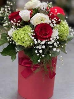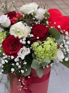 Elle est composée de roses rouges et de fleurs blanches avec sa verdure , le tout avec un sujet sur pic ST Valentin.